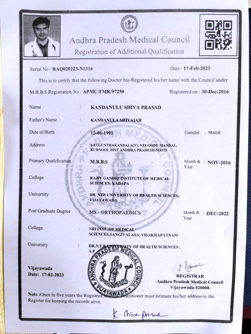 Dr. Shiva Prasad is a highly qualified Orthopaedic Surgeon with specialization in Arthroscopy and Joint Replacement Surgery. With expertise in minimally invasive techniques, he provides advanced treatment for knee, shoulder, and joint-related problems.